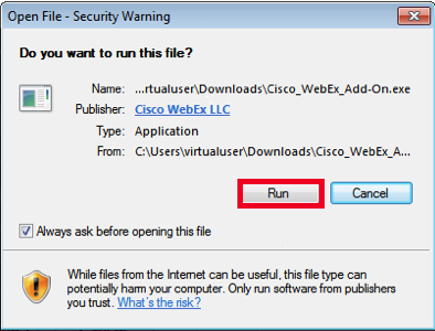 - Click 'Run' to start the Cisco WebEx Meeting Center